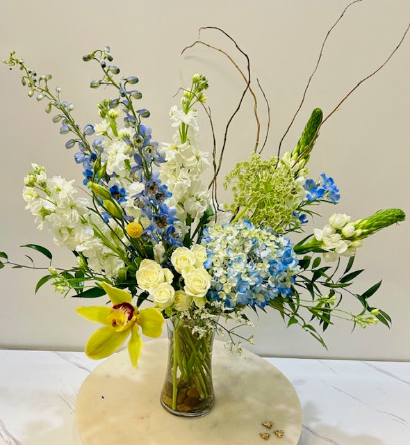 A soft and uplifting arrangement in gentle shades of blue, white, and touches of yellow. Designed in a natural garden style, this piece evokes a sense of peace, warmth, and quiet joy—like the song of a bluebird at dawn. A graceful tribute to a life remembered with love and light.