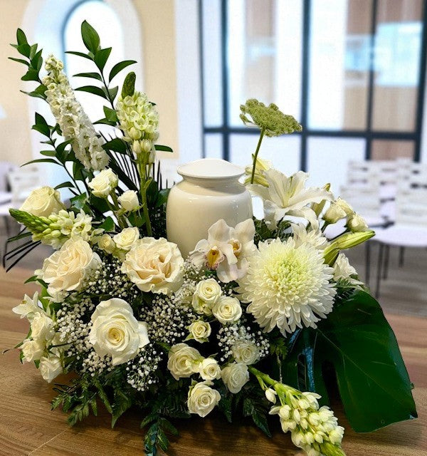 A graceful tribute in all-white blooms, designed to surround the urn with softness, purity, and quiet beauty. Arranged in a natural garden style, this piece offers a peaceful and elegant expression of love and remembrance.