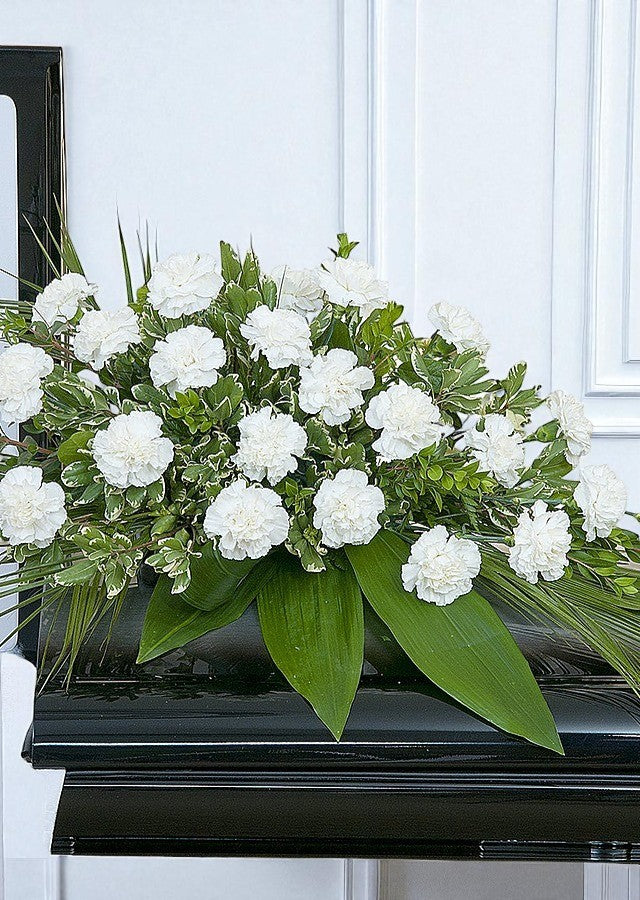 A modest and heartfelt arrangement of fresh white carnations, offering gentle comfort and quiet remembrance in a timeless design.
